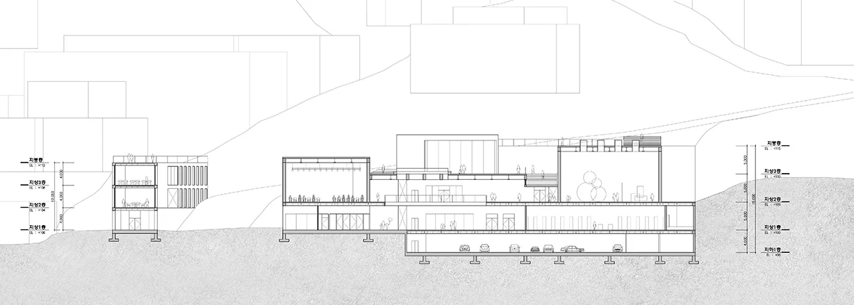 해 전시공간의 자연채광을 적극적으로 받아들인다. 다목적홀 역시 오픈 아카이브 플랫폼의 2층에서 연결이 되어 북악산과평창문화로의 전경을 배경으로 다양한 이벤트 및 강연회가 이루어질 수 있도록 계획되었다. 프로젝트 갤러리는 옥상의 외부공간으로 열릴 수 있는 가변적 형태로서 내-외부를 동시에 전시 공간으로 사용할 수 있는 형태로 계획되었다. 커뮤니티 러닝센터는 좁은 대지의 형상을 따라 선형으로 계획되고,평창20길과 21길 사이에 외부 연결로를 계획하여 대지로의 접근성과 연결성을 추구하였다. 숲의 정원과 물의 정원은 외부 전시-휴게 공간으로서 건축물이 위치한 두 개의 다른 대지와 보행로로서 연결되어 네 개의 별도의 대지가 하나의 흐름으로서 조직된다.
