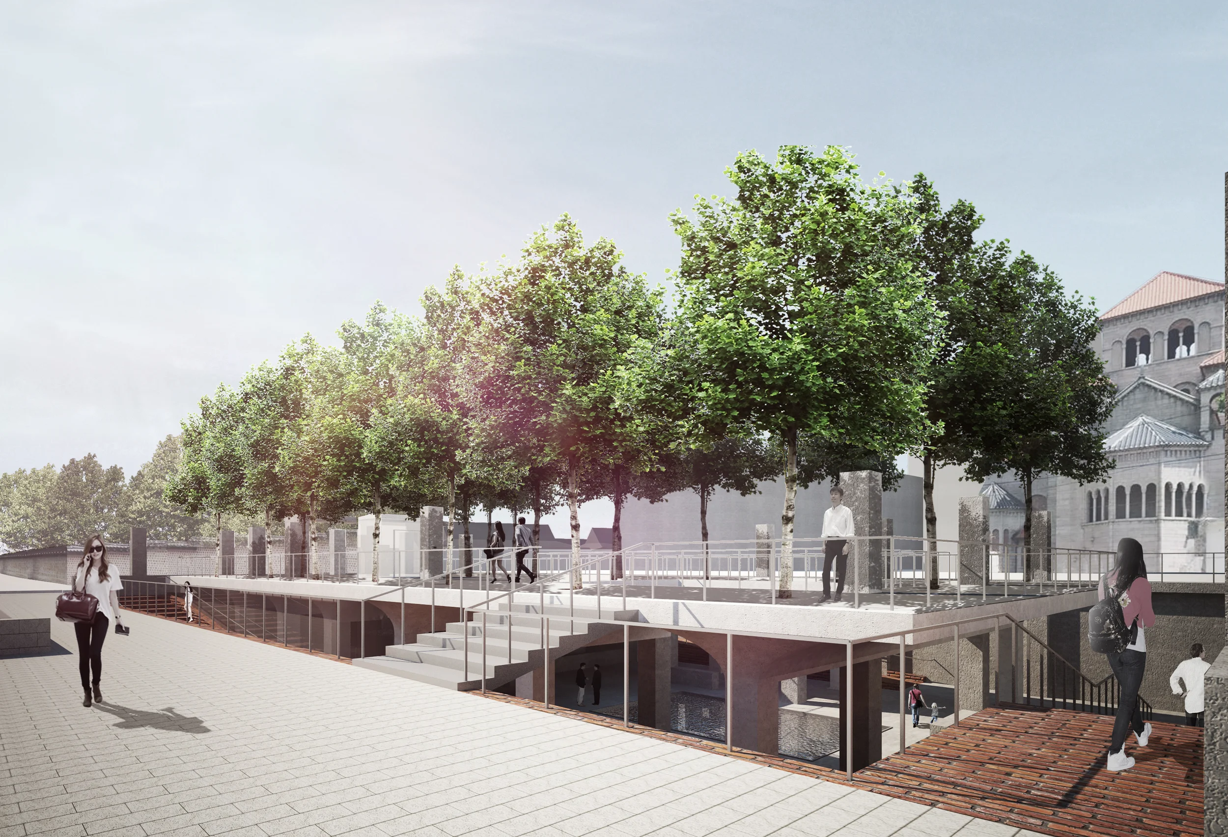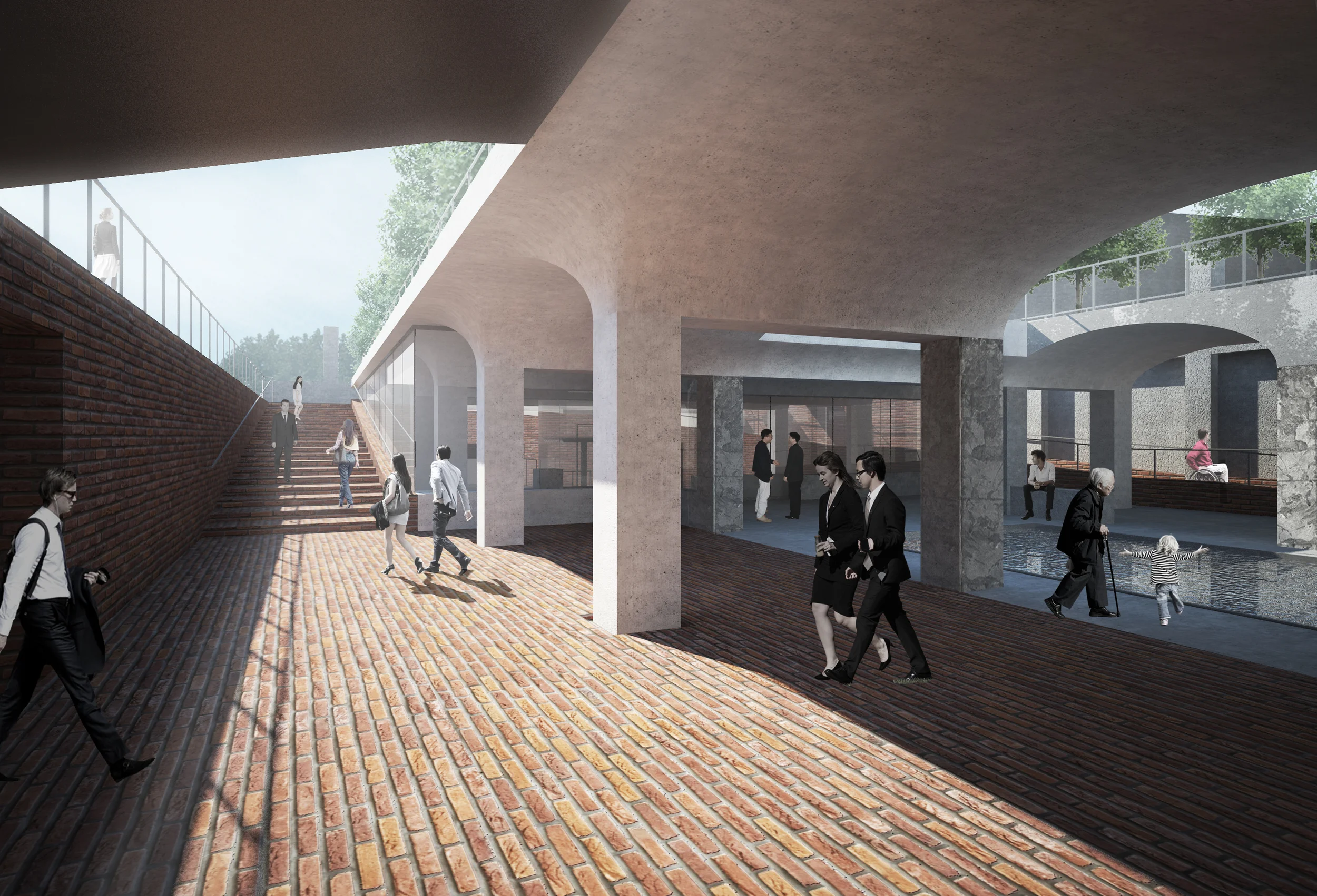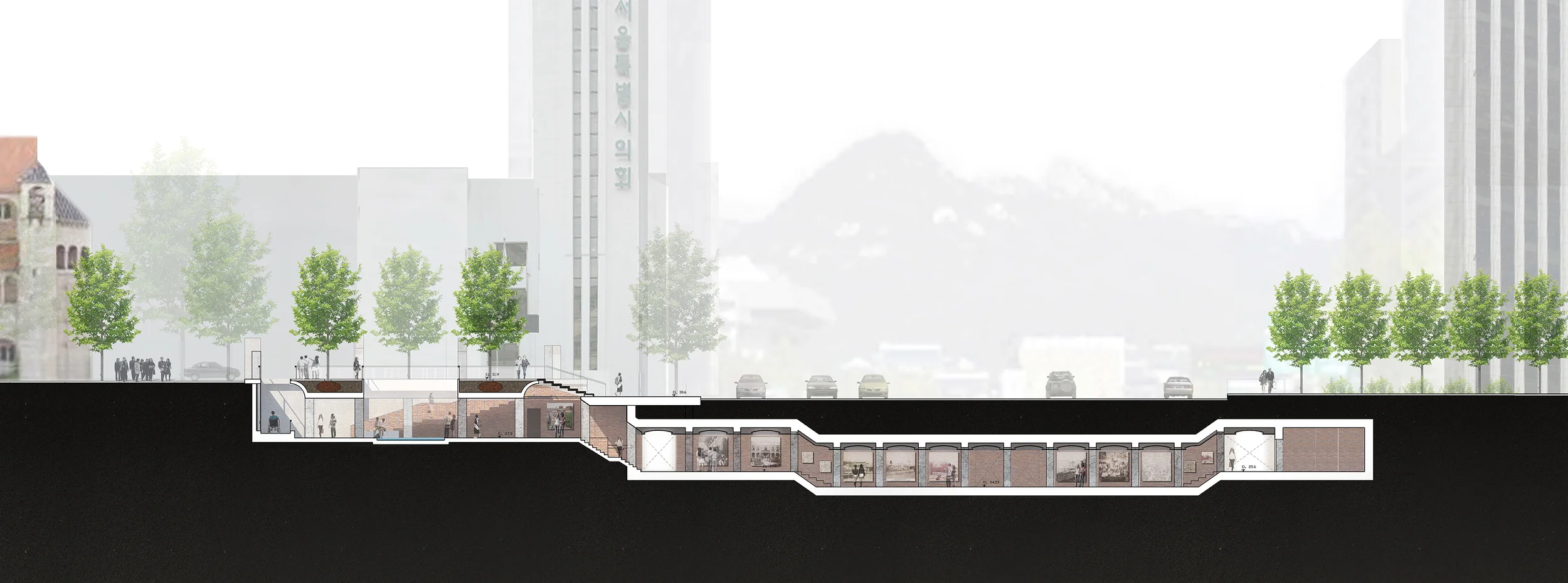 MMK+ proposed an underground cultural space that includes Seoul City's history archive and public open space that links to the existing underground pedestrian network. By preserving the remained concrete structures plus overlaying a new brick surface, the visitors can experience different layers of history of the site. On the ground level, a 'floating forest' is proposed in order to provide the visitors with a calm and poetic shelter from the wide street with heavy traffic. The forest is slightly lifted up from the ground level, creating unique pedestrian experience and harmonized streetscape with the historical context around the site. The masterplan envisions future underground expansion below Sejong-daero from the proposed underground space of the site to the existing City Hall. This future expansion space will be a circulation node that connects the existing underground network to north and south, and will also provide the Seoul citizens with exhibition, lecture, and public event space that are related to history of modern architecture and history of Jeong-dong area
