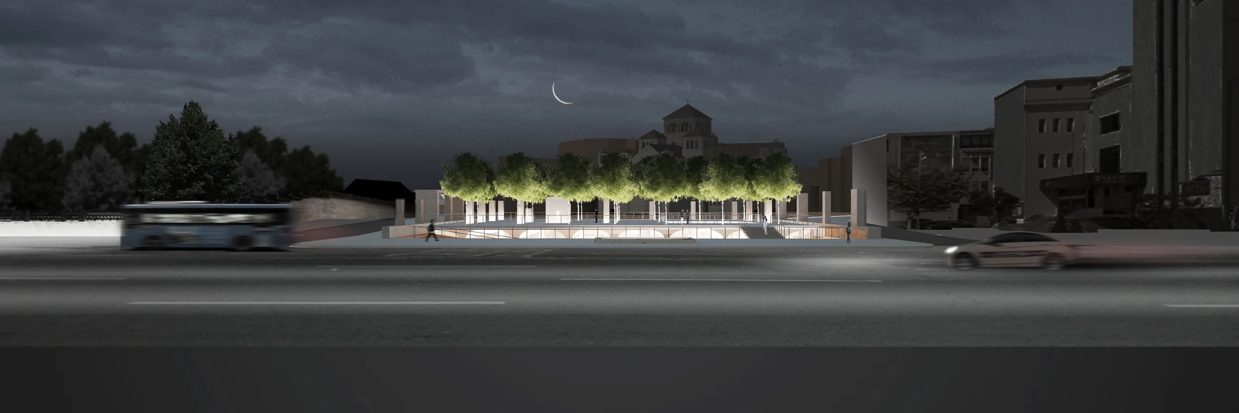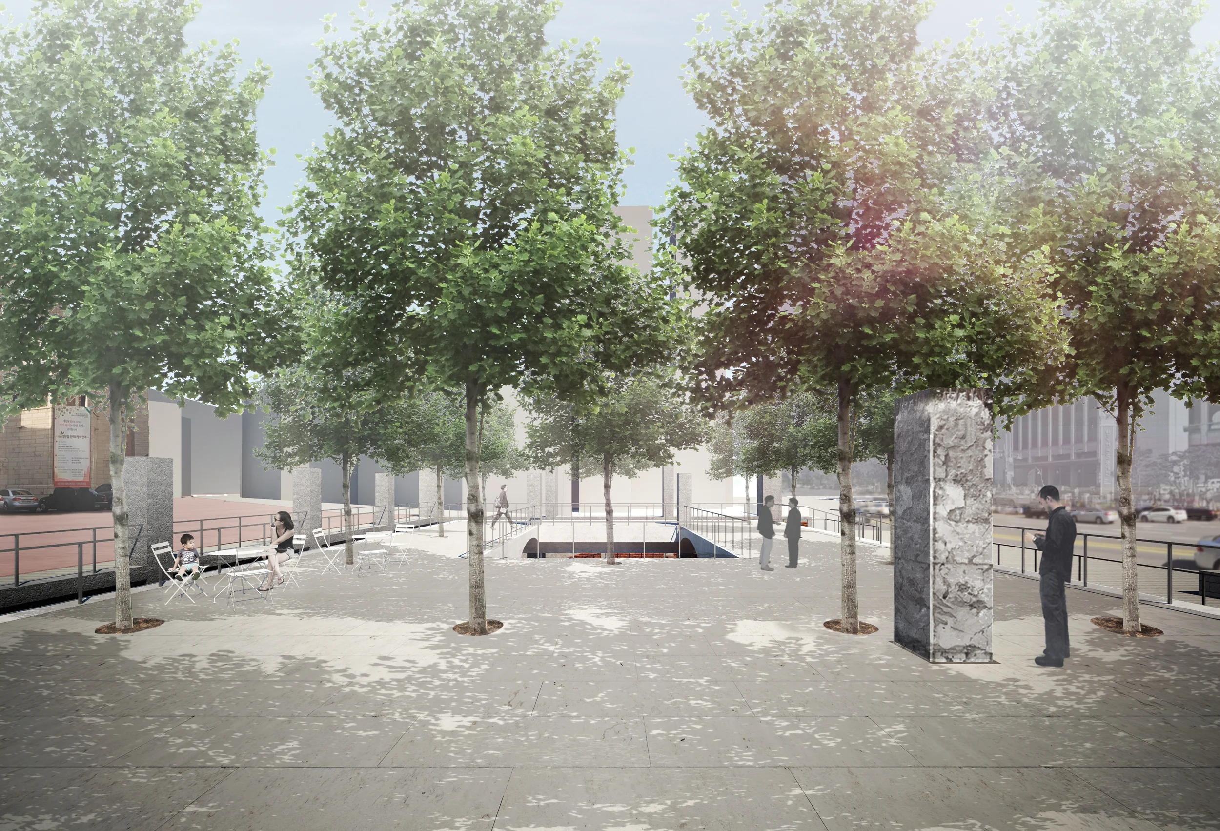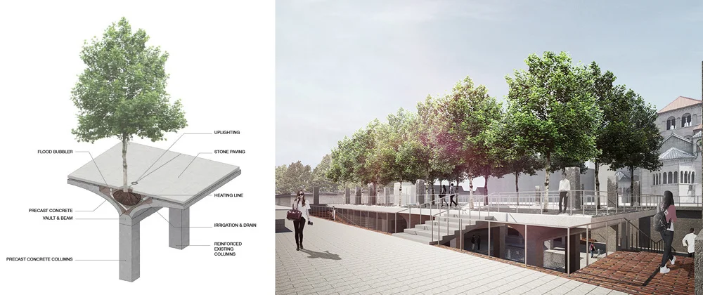 MMK+ proposed an underground cultural space that includes Seoul City's history archive and public open space that links to the existing underground pedestrian network. By preserving the remained concrete structures plus overlaying a new brick surface, the visitors can experience different layers of history of the site. On the ground level, a 'floating forest' is proposed in order to provide the visitors with a calm and poetic shelter from the wide street with heavy traffic. The forest is slightly lifted up from the ground level, creating unique pedestrian experience and harmonized streetscape with the historical context around the site. The masterplan envisions future underground expansion below Sejong-daero from the proposed underground space of the site to the existing City Hall. This future expansion space will be a circulation node that connects the existing underground network to north and south, and will also provide the Seoul citizens with exhibition, lecture, and public event space that are related to history of modern architecture and history of Jeong-dong area