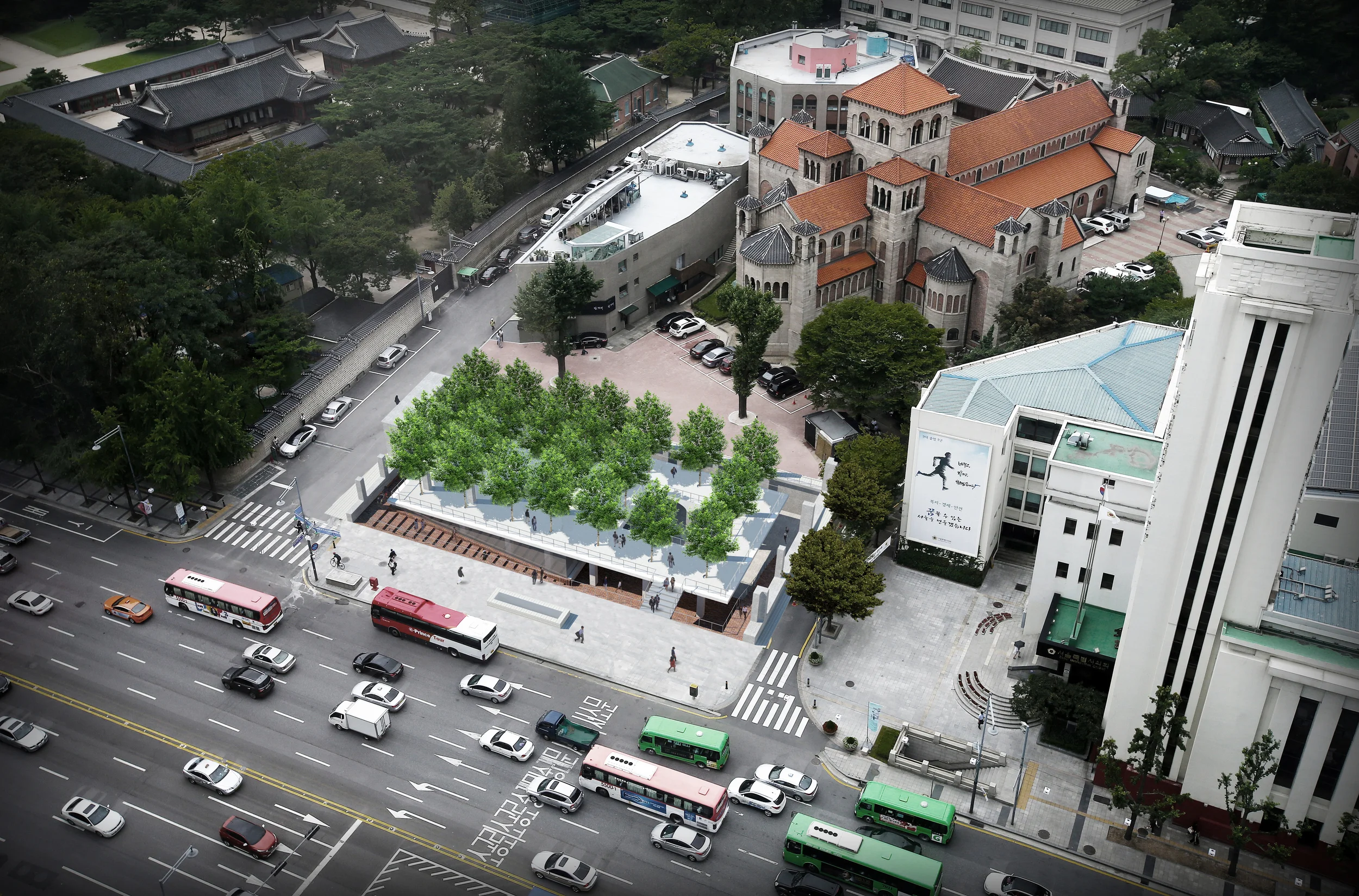Traditionally, the Pagoda tree had been planted in the important places such as king's palaces, which can be often found in Jeongdong and Deoksu palace. 23 pagoda trees planted on the structure grid are harmonized with the preserved columns from existing structure, creating an atmosphere of Madang - a open space in the traditional Korean architecture. From the street level, the sillouette of cluster of trees on the floating concrete structure creates unique streetscape, also harmonize with surrounding context such as Deoksugung palace and Seoul Anglian Church.
